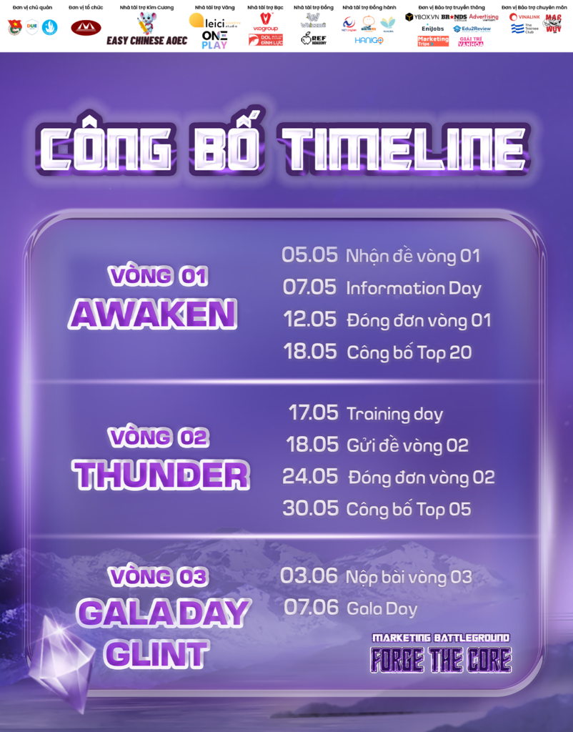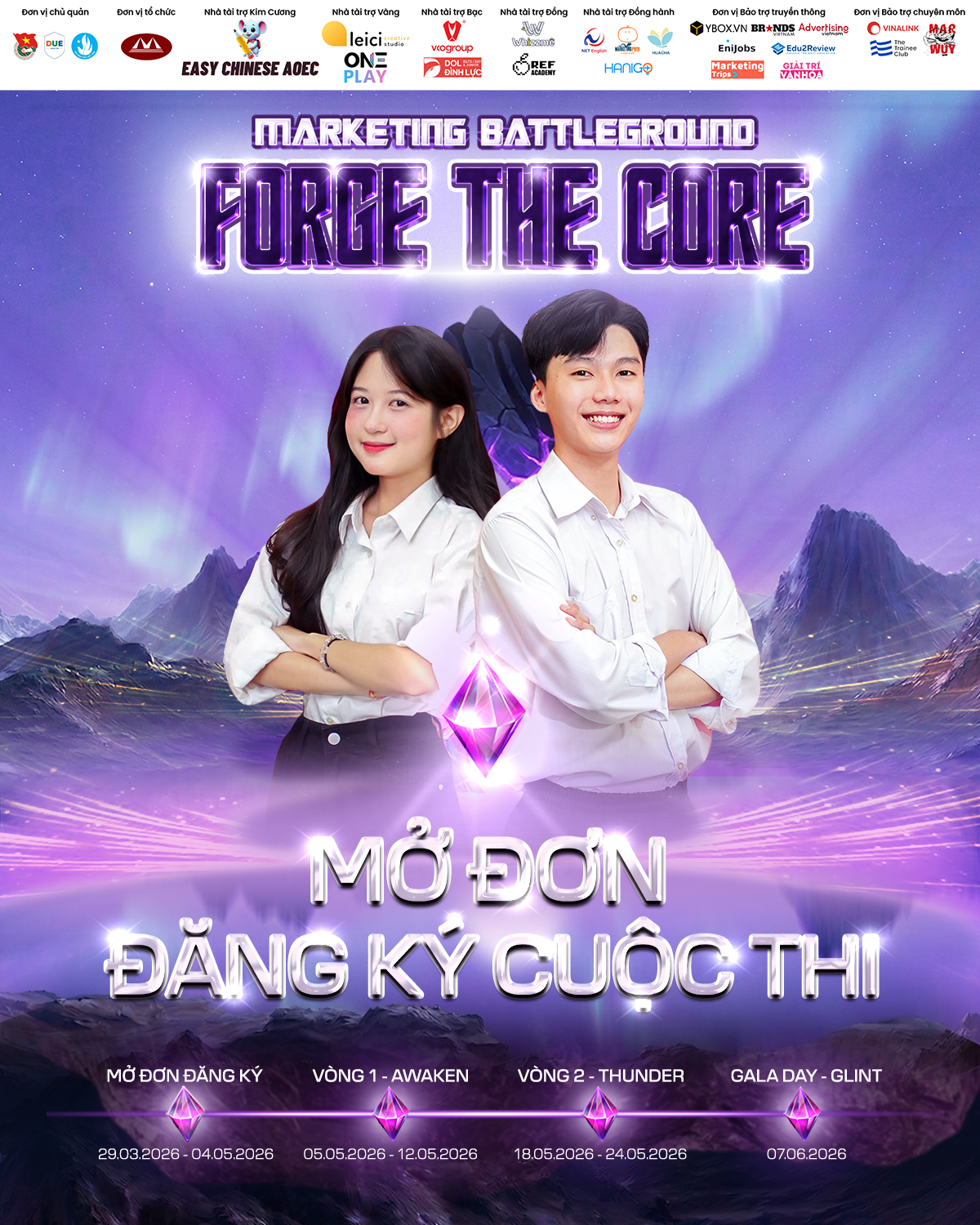 Trải qua hai mùa giải thành công vang dội, cuộc thi không chỉ khẳng định vị thế là một đấu trường Marketing thực chiến quy mô mà còn mang trong mình tinh thần bứt phá đầy mạnh mẽ. MARKETING BATTLEGROUND: FORGE THE CORE tin rằng, mỗi Marketer trẻ đều là một khối quặng thô ẩn chứa lõi năng lượng quyền năng. Sân chơi này chính là sàn đấu lý tưởng để các bạn thể hiện tài năng, trải qua những thử thách khắc nghiệt nhằm định hình tư duy chiến lược và tạo dấu ấn khác biệt. Hơn cả một cuộc thi, đây là hành trình đập vỡ lớp vỏ bọc an toàn, nơi bạn được cọ xát với đề bài thực tiễn từ doanh nghiệp, xây dựng chiến lược Marketing hoàn chỉnh và chinh phục Ban giám khảo qua những màn phản biện sắc bén. MARKETING BATTLEGROUND: FORGE THE CORE vừa là một hành trình tinh luyện, vừa là biểu tượng của những Marketer trẻ đầy bản lĩnh, sẵn sàng đương đầu với thử thách khắc nghiệt để đánh thức viên “đá năng lượng” ẩn sâu bên trong.